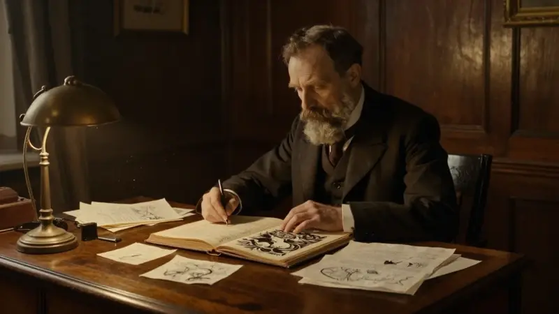 Sigmund Freud, sentado en su estudio vienés a finales del siglo XIX, analiza un libro con ilustraciones oníricas mientras toma notas sobre psicología.