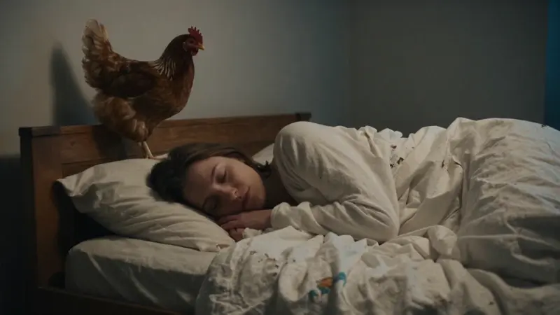 Mujer durmiendo en una habitación tenue con una gallina marrón posada en el pie de la cama.