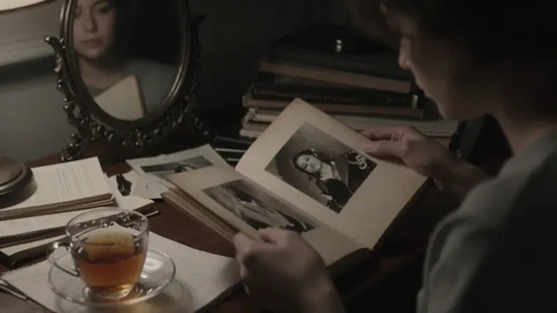 Mujer sentada en un estudio antiguo, mirando pensativamente una fotografía parcialmente visible, rodeada de libros y con vistas a una ciudad lluviosa.