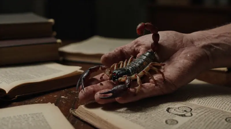 Mano sosteniendo un escorpión en un estudio antiguo lleno de libros sobre psicología y análisis de sueños.